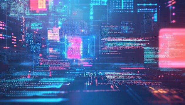 Futuristic coding screen with digital interface elements