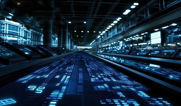 Futuristic factory hallway displays glowing digital code.  Long corridor with glowing displays of data streams