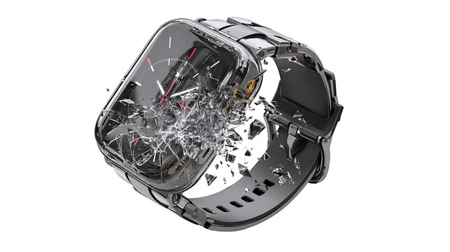 Falling smartwatch with shattered screen and broken strap, dynamic tech concept, isolated on a white background