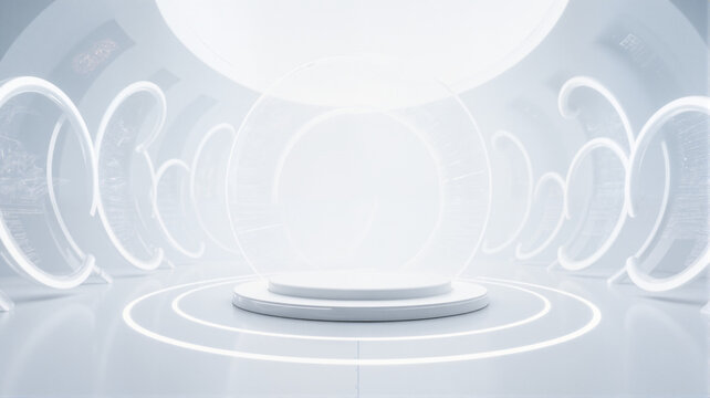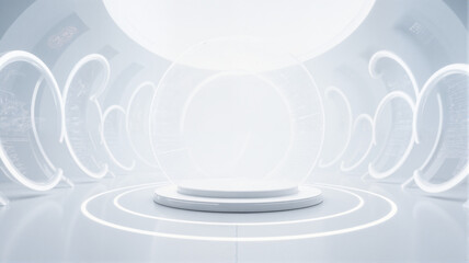 Futuristic product launch stage for corporate marketing campaign, holographic smartphone interface displayed on modern tiered platform with dynamic lighting and atmospheric fog effect