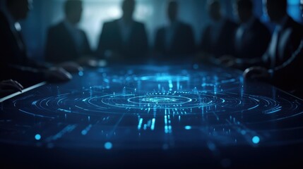 A person in a suit sits in front of a glowing blue digital display, exuding a sense of contemplation and focus.