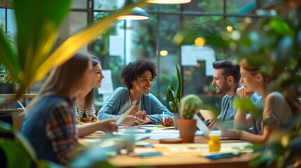 A diverse, casual design team collaborates in the office, creating innovative solutions and fostering in dynamic creative environment.