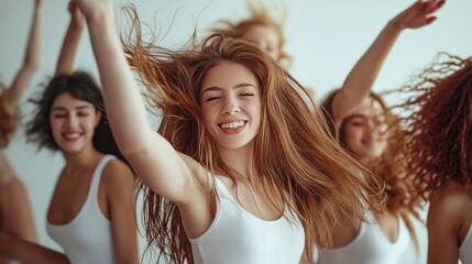 A group of young women express pure happiness as they dance together in a spacious urban studio. Their hair flows freely, and laughter fills the air, creating a lively atmosphere