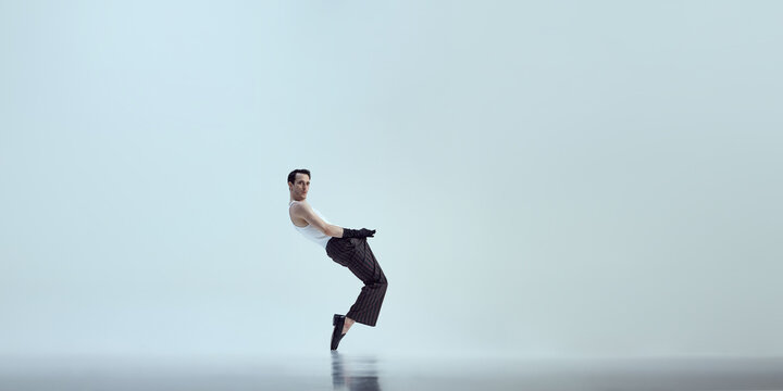 Dynamic silhouette of modern dancer man against bright white background. Fluid expressive pose. Freedom, fun dance, artistic performance. Contrast motion Creative project, inspirational fashion poster