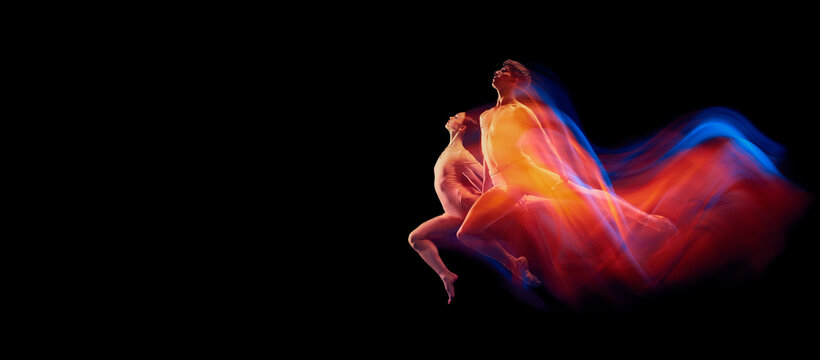 Attractive woman dancing jazz-funk on red and green neon background in a studio. Modern dynamic and energetic dance choreography. Full length.