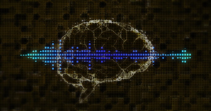 Digital brain and sound wave image over dark grid background