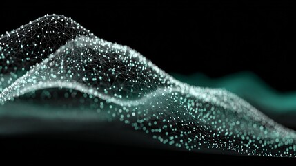 A digitally rendered teal wave of connected dots over a black background, with blurry detail