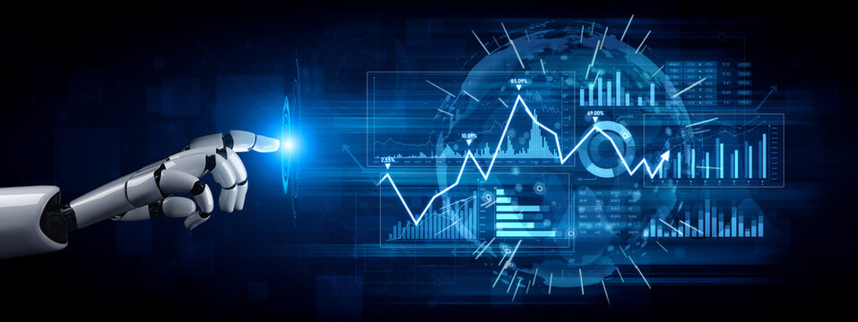 A futuristic robotic arm engages with a glowing projection of data visualization over a global sphere, symbolizing advanced technology and digital innovation dynamics. Scalp