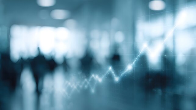 Abstract digital graph showing upward financial growth over a blurred modern office background