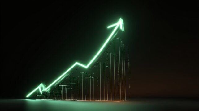 Futuristic financial growth concept with glowing upward trend arrows and bars representing economic progress and investment success over a dark background