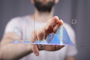 Business professional analyzing interactive tablet with floating data graphs and charts