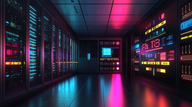 vibrant, futuristic data center with glowing servers and colorful lights creates dynamic atmosphere, showcasing advanced technology and innovation