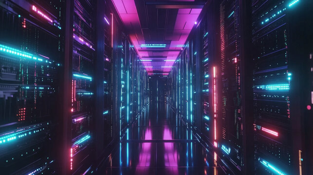 Data Center Corridor: a vast server room or data center, presenting rows of modern server racks with vibrant neon illumination creating a futuristic and dynamic environment.