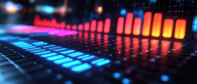 Abstract Digital Data Visualization: Neon Glowing Bars and Grid