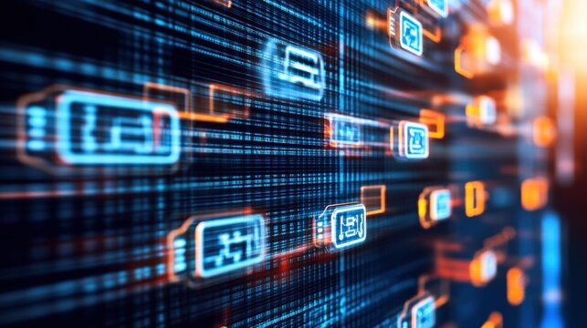 Abstract digital illustration of glowing data streams and icons flowing over a gridded background symbolizing intricate data transfer processes visually represented.