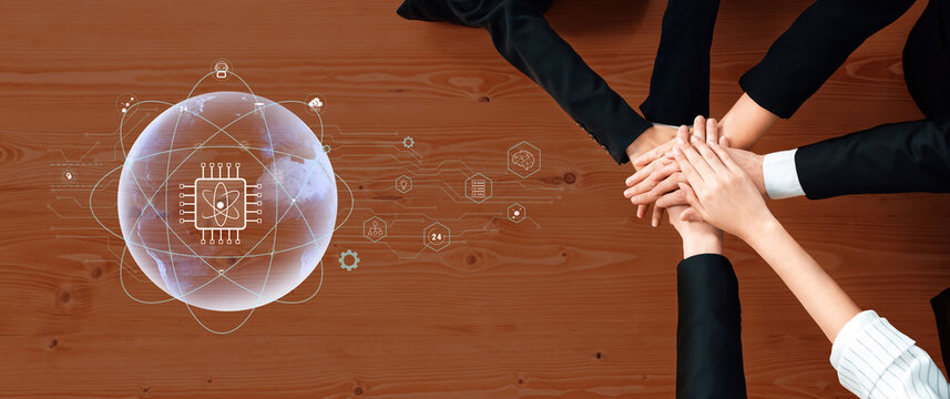 A dynamic representation of teamwork and technology showcasing diverse hands joining together over a digital globe and network, symbolizing innovation and collaboration in business. Trope