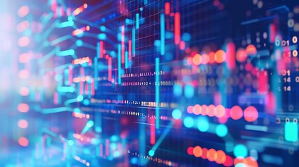 Financial data visualization features glowing trading graphs, digital analysis on dark background. Investment strategy, market trends, stock performance represented with vibrant, colorful indicators,