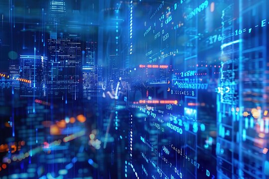 Concept of stock market and fintech forex concept. Blurry blue digital charts over bright blue background. Futuristic financial interface. 3d render design. City double exposure