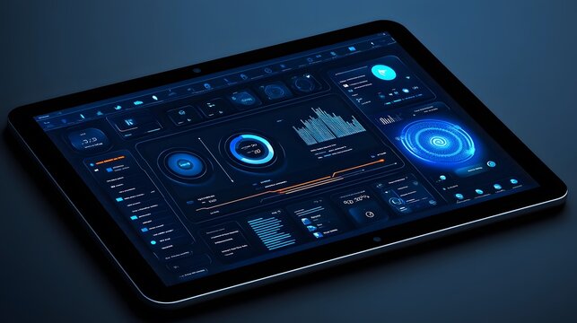 Futuristic tablet display showcasing interactive dashboards with dynamic data visualizations, charts, and graphs.  Sleek, dark interface with glowing blue accents.