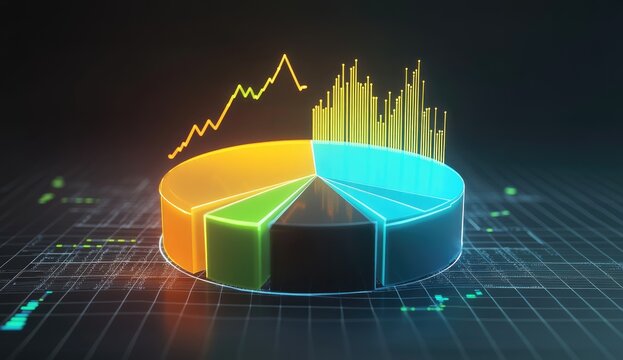 Ultra-realistic 3D illustration of a colorful pie chart with detailed financial graphs in the background for business data analysis