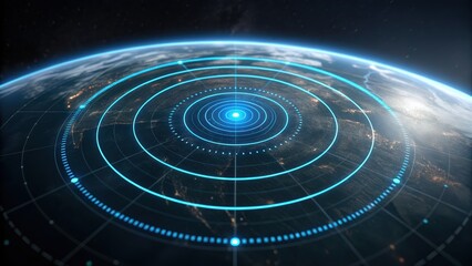 A digital representation of Earth with concentric circles and glowing blue elements, suggesting a high-tech interface and global connectivity.