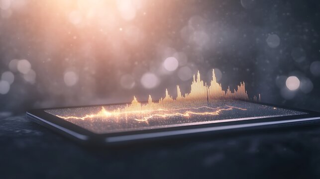 Dynamic data visualization on a tablet with glowing waveforms against a blurred background.