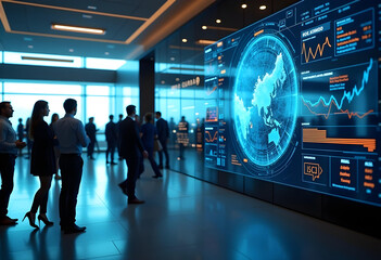 In modern office environment, business professionals observe dynamic data visualizations on large screen, showcasing fast moving analytics and trends. atmosphere is focused and energetic, reflecting f