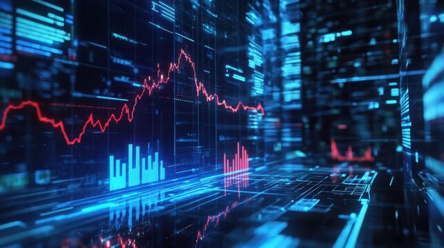 dynamic visualization of financial data with glowing graphs and charts, showcasing trends and fluctuations in modern digital environment