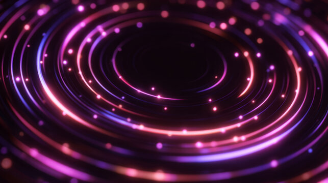Vibrant neon rings and vertical light trails forming abstract digital portals in a dark sci-fi environment