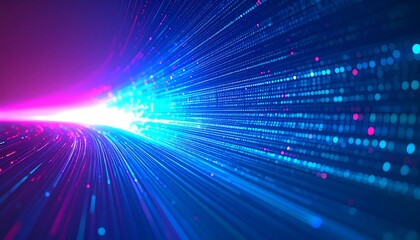 Vibrant digital data stream with glowing blue, pink lines, representing fast information transfer, technology. Abstract futuristic concept shows binary code, light streaks, progress, cyber networks.