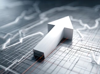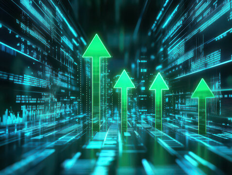 Abstract digital illustration featuring green upward arrows signifying growth and progress in a futuristic data environment.