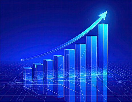 Abstract graphic of a rising bar graph.  A futuristic,  blue bar chart with a clear upward trend
