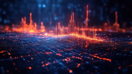 A vibrant digital landscape showcasing data visualization with waves and peaks, illuminated by glowing dots and lines against a dark background.