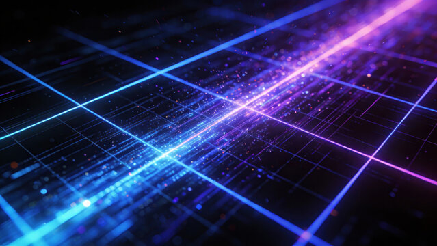 Abstract digital grid with glowing blue and purple data streams, representing technology, network, and data flow in a futuristic cyber environment.