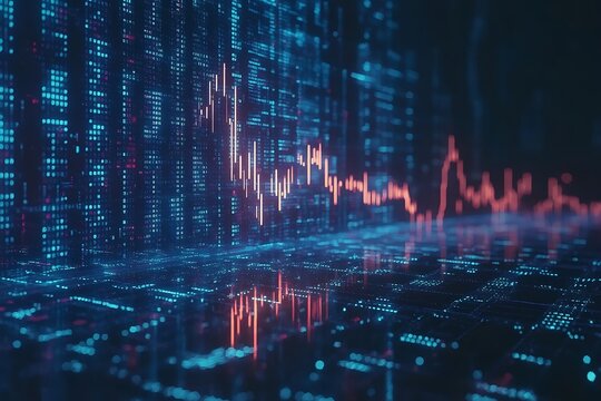 Abstract data visualization with vibrant colors, binary code, and dynamic graphs representing technology and finance.