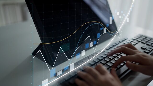 A close-up view of hands typing on a keyboard in front of a laptop screen showcasing dynamic graphs and charts, emphasizing data analysis and financial strategy. Copula