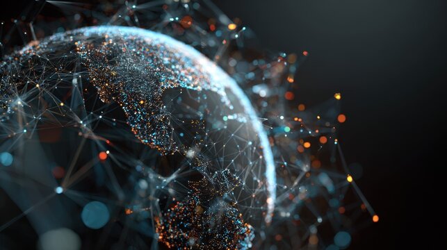 A digital globe formed by a network of interconnected nodes and lines symbolizes the advanced technology and global connectivity in the digital age