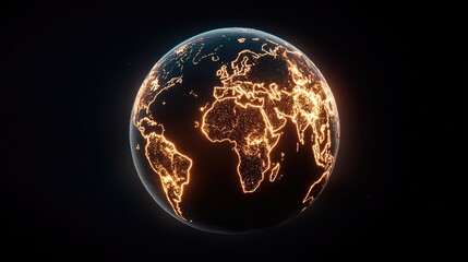 A glowing, digital representation of Earth, showcasing illuminated continents and connections against a dark background.