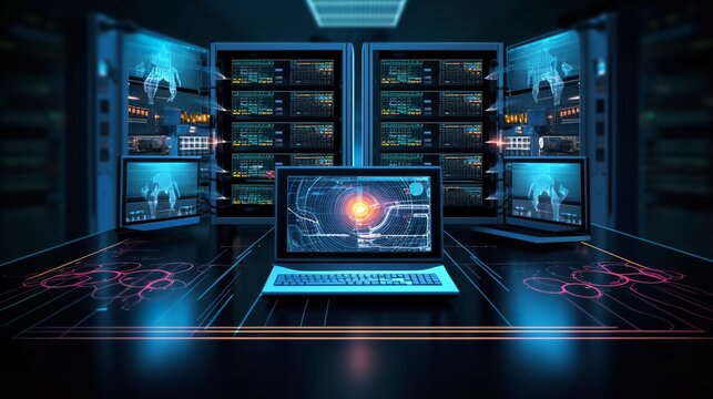 Encrypted data transfer in server room with digital overlay