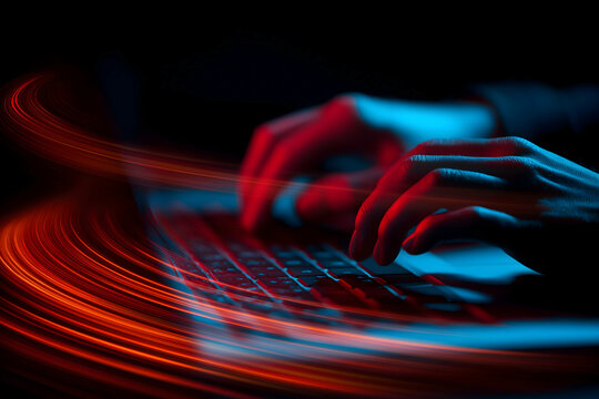 Hands typing on a keyboard with dynamic red and blue light trails symbolizing fast digital communication and data flow.