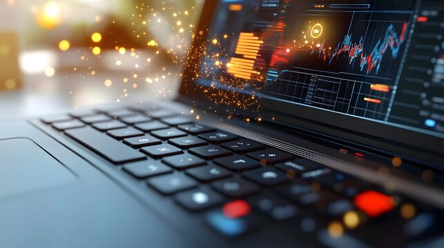 Futuristic Data Analytics Overlay on Laptop Keyboard with Dynamic Glowing Charts and Graphs Depicting Insightful Financial and Statistical Information for Advanced Technology Concept