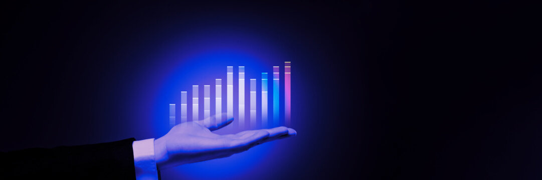 Holographic display of bar graphs emerging from hand, showcasing modern technology and dynamic business analytics. Concept of business, innovation, financial report, marketing. Banner