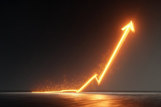 The illustration shows a vibrant green arrow graph trending upwards against a dark background with bokeh effects and grid lines, suggesting growth or progress.