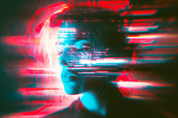 A person with digital glitch effects, artistic style, on a red and blue background, concept of digital identity. Generative AI