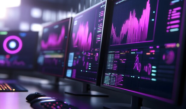 close-up of multiple computer monitors with futuristic and dynamic AI-based data visualizations, charts, graphs, holographic displays showing market trends or financial analytics