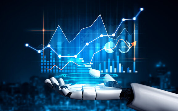 A robotic hand interacts with digital analytics, displaying dynamic graphs and charts in a futuristic setting. This image symbolizes technology and innovation in data analysis. Scalp