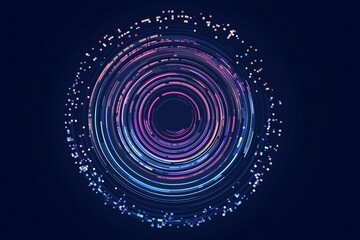 Circular data visualization with a red focus point.  Abstract  interactive dashboard with multicolored concentric circles, overlaid with various charts and graphs