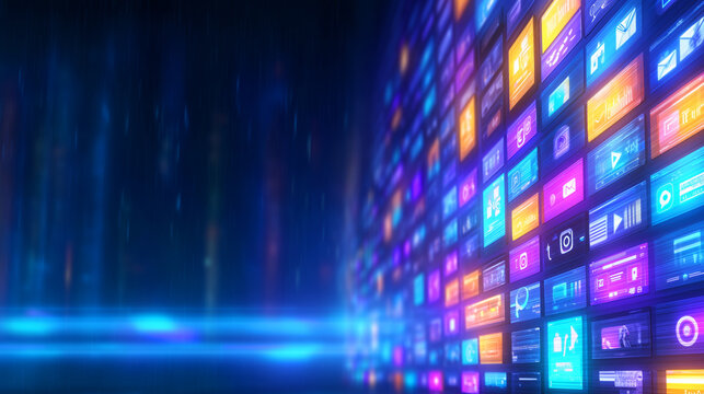 Dynamic digital communication virtual environment graphic visualization futuristic setting neon colors technology concept