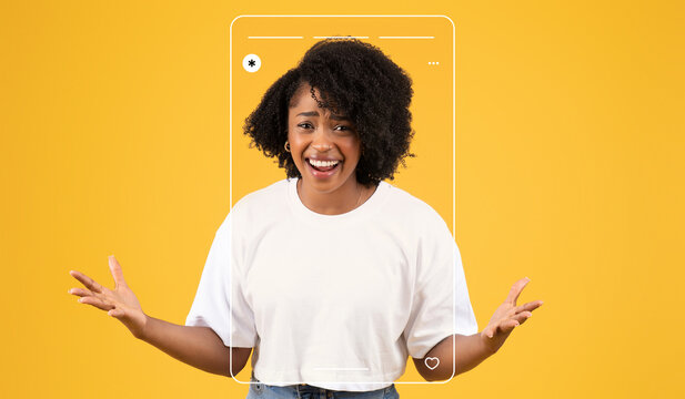 A young woman stands with a wide smile, expressing excitement as she interacts with an invisible social media interface. The bright yellow background adds energy to the scene.
