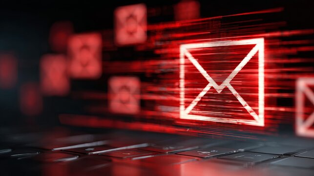 Dynamic email icon with motion blur on keyboard background, representing modern digital communication.